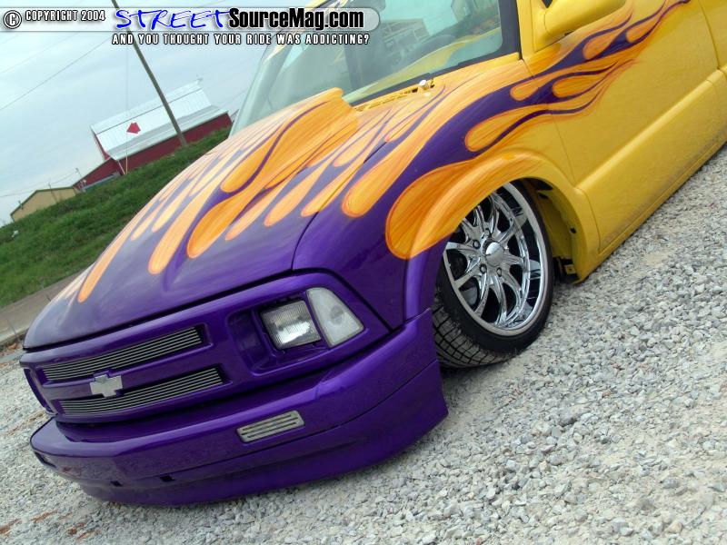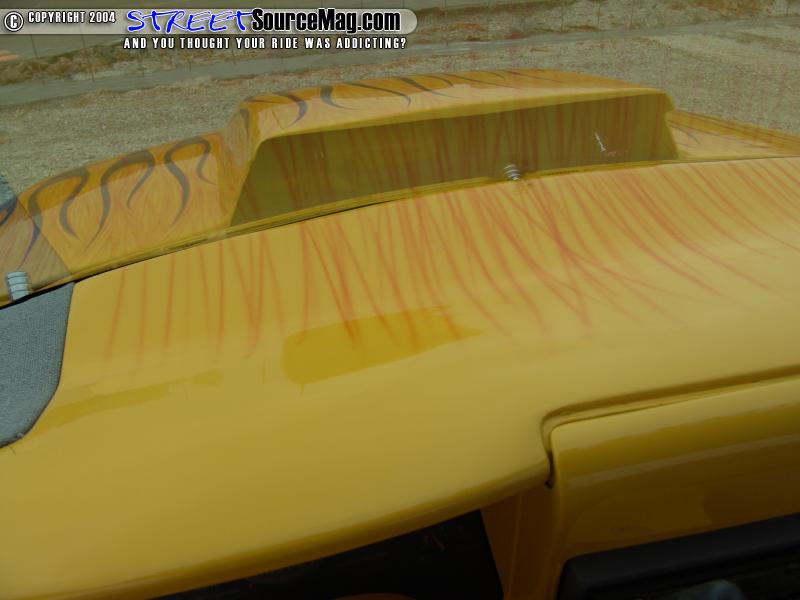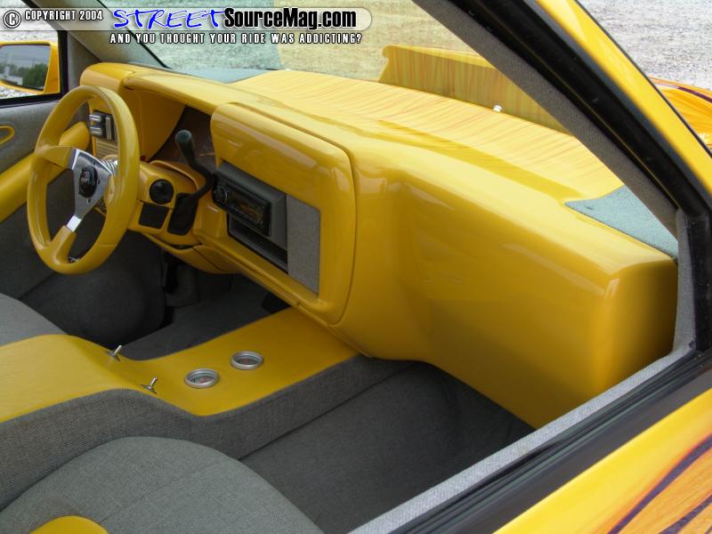The stock Chevy seats were scraped for a new set of Saturn buckets. The rest of the interior, including the custom-built center console was wrapped in gray tweed and yellow vinyl. Brandon McDonald from Lebanon, Tennessee did most of the interior work. For the final touch, a billet steering wheel and several billet accessories were added.