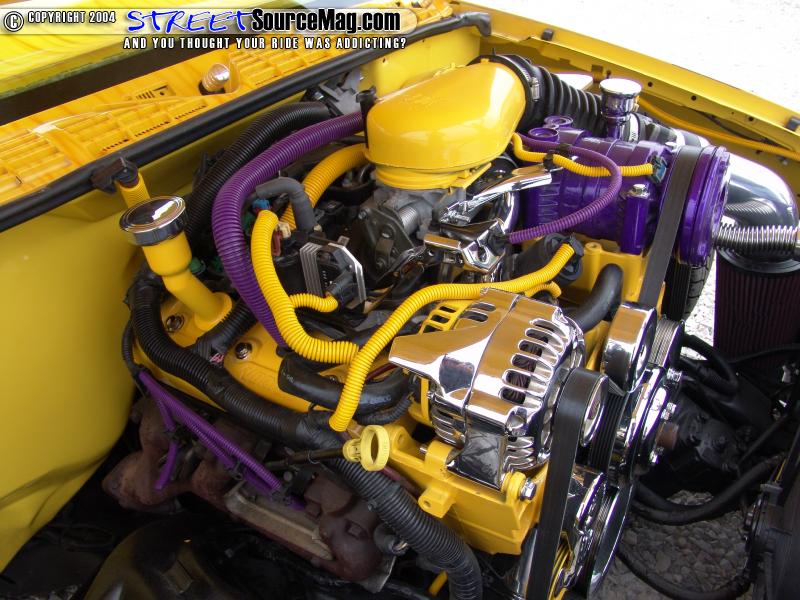Since the motor was already out for the body dropped, Jerry and Amanda decided to do a little paint and chrome work to the 4.3 liter Vortec V6. The entire motor was painted with yellow and purple, while pullies and several brackets were chromed for a little shine under the hood. A polished intake and a few billet goodies were also added to clean up the engine bay a little.