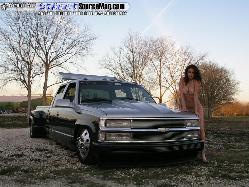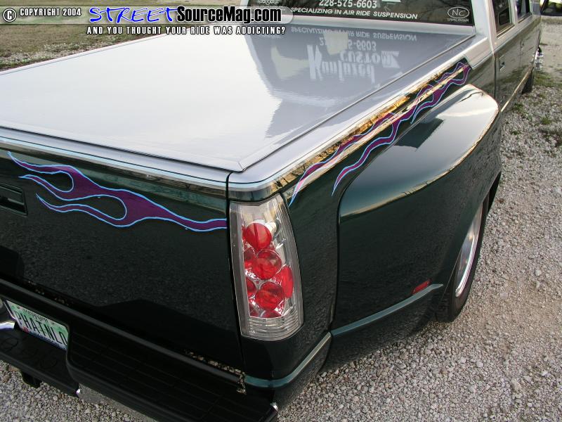Kevin’s next line of business was to change the appearance of the pig to that of a prize winning swine. He started by adding a Goodmark 3” cowl induction hood. After the entire body was smoothed to perfection Kevin applied several coats of RM-Diamont Green and Silver base coat to the entire truck in a two-tone fashion.   Once the base was dry Kevin wanted to separate the two colors by airbrushing the appearance of a chrome stripe. Last but not least black and blue pinstripe was added for more detail.