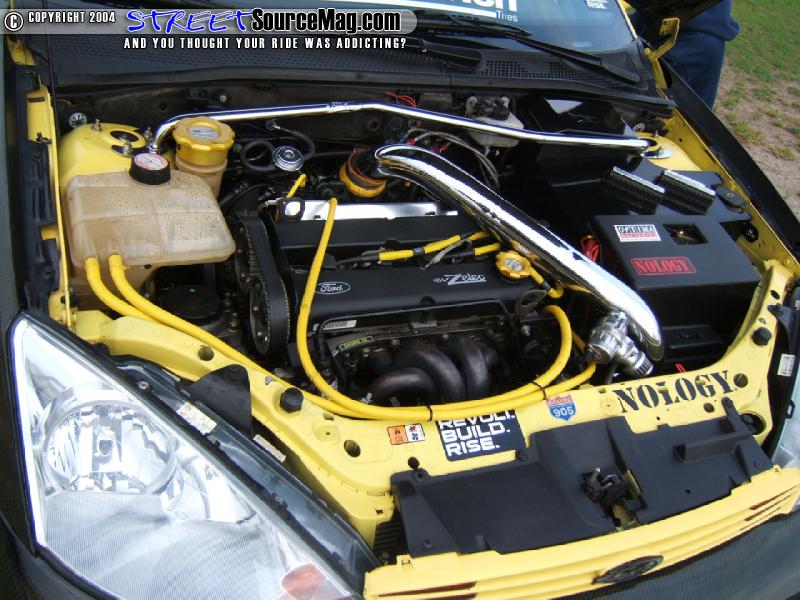 With the word Sport Compact, Freddy would decide to beef up the Focus to ensure his it was really a sporty compact. For starters the installation of a Turbo Performance turbo kit (garret T28 turbo, Blitz blow off valve) would be installed along with a PWR intercooler and radiator. To keep from turbo lag Freddy would then install a Nitrous Express 50 shot fogger nitrous kit, N-Tercooler kit and purge valve with 3 tanks.