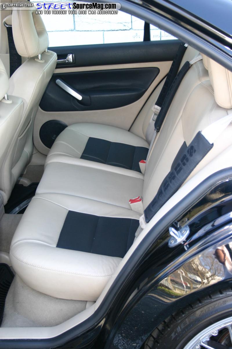 The interior was fitted with an R32 Brushed aluminum dash kit, door handles, Chrome circle rings inside the cluster, Beetle headrests (3 in the rear), custom two-tone black and beige leather seats and door panels, Beetle Turbo S aluminum door lock pins, custom red LEDS inside handles, VW Passat W8 overhead sunroof console, VW 20th. Anniversary black hand-brake boot with silver stitching and a euro headlight switch.