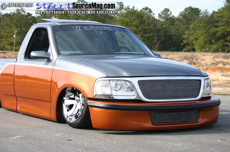 The bed features a clean and smooth setup along with some diamond plate filler panels. A modified front bumper, billet grille, chrome grille shell, and APC lights all set off the front of Joeys 150. Shane Barton then laid down the PPG burnt orange and grey paint job with a silver graphic emphasizing the two colors. The graphic was outlined in black to set it off from the other colors.