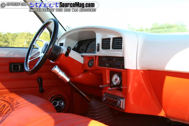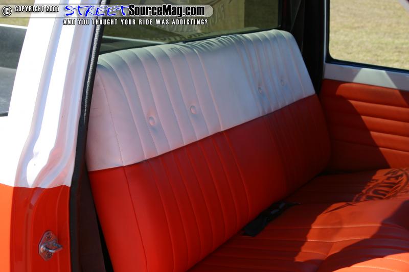 The interior of the truck features a painted dash, wrapped door panels, bench seat wrapped in white and orange, billet steering wheel, and a Pioneer head unit. Gary’s Auto Interiors performed the wrapping.