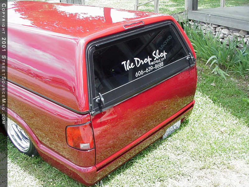 The next stop for Mike's S-10 was Frisby's Hi-Tech in Marshall, NC. Greg Frisby went straight to work shaving the door handles, tailgate handle and antenna. Frisby then welded in a Sir Michael's steel rollpan. With the engine and transmission out, Frisby smoothed the firewall for added show points. Frisby bolted on a bumper and valance combo from a '98 S-10. Now, smoothed and ready for paint, Frisby used PPG Dark Cherry Red Metallic to bring Mike's S-10 to life. To finish the exterior, clear corner lamps were bolted in place. Going full show means changing everything, interior included. Mike did just that. Changing the factory grey cloth out, he chose oatmeal tweed and went straight to work. Mike wrapped the dash himself, and with the help of friends and family, treated the rest of the interior to same level of attention. The factory seats were ditched and in their place a set of '86 S-10 Blazer seat covered in oatmeal tweed bolted in. Flamed door panels were installed as well and flames throughout the rest of Mike's S-10. Everything was changed to match, including the seatbelts and vents. A billet rear view mirror was put in place and finishing things off, a Billet Specialties Spyder 2 steering wheel was added.