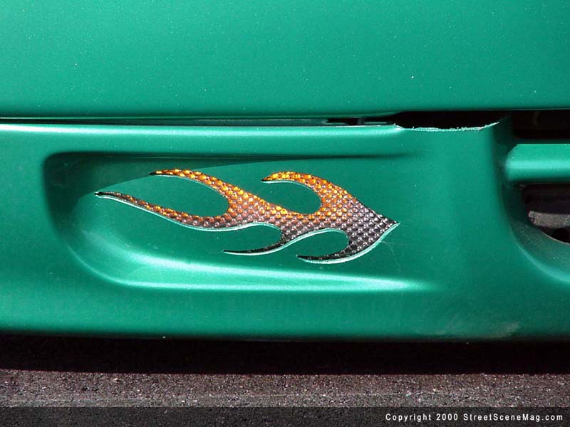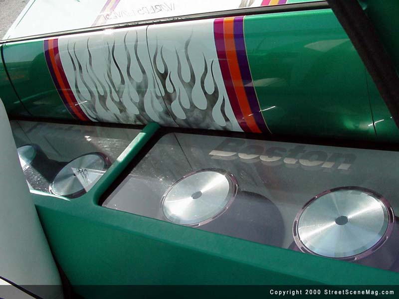 Attached to the new wheel, Nathan also came up with a custom steering column, which features relocated blinker, wiper, and light controls. The new gauges with a tachometer were also relocated. To give the finishing touches, the seats were upholstered in green vinyl with white leather. The dash EQ and amplifiers were all painted with graphics to flow along with the graphics through the Toy. The headliner was also customized with flames. Other notables are a Momo shifter, Momo aluminum pedals, and Momo 4-point racing harness seat belts. To follow up the full custom interior, Nathan went to town on what he does best, the stereo system. The head unit of choice was a Eclipse 5303 am/fm CD player. To keep the music balanced and in tune, he went with a Precision Power DEQ-230 (30 band) EQ. To play the music, Nathan captured a sponsorship by Boston Acoustics and put in a set up 3-way Pro 6.53 separates and 4 10-inch subs. To push his bad ass speakers, Nathan went with 2 Precision Power PC-2600 amps. Monster cables were used throughout the system along with an Optima battery to keep the juice to the amps.
