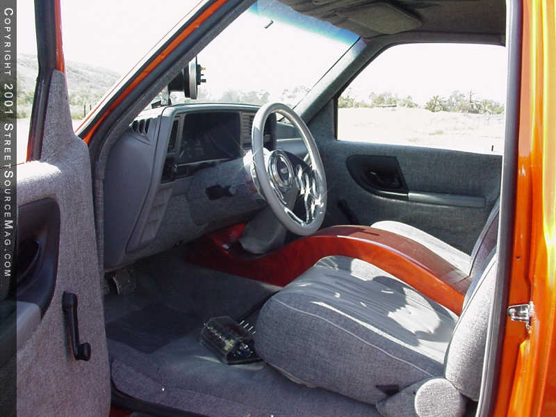 There is no show vehicle complete with out full interior and a kick ass stereo system. Knowing this, Ryan went to town on some of his own kick ass ideas. The first thing he would do would be to install a sweet system. The CD player of choice was a Pioneer deck. Through out the rest of the stereo, Crystal components where used along with four 10-inch subs, which are located in the extra cab. To accent the stereo, Ryan had a custom center console made and painted the same color as the truck along with ghost flames to accent it. To compliment the new center console, he installed a Weld Flames steering wheel.