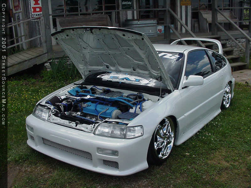 Brandon knew to turn heads and win shows he would have to make his CRX as clean as possible. Tommy Rickard from Asheville was called in to handle the task. Starting from the front and moving to the rear, Rickard shaved the door handles, emblems, squirters and antenna. Next, a Wings West RS Series body kit was installed along with a new wing. A mesh grille was installed in both the front and rear bumpers. To finish it off, clear corner markers and bumper lenses were installed. Finally, Rickard brought Brandon's CRX to life using Dodge Stealth Pearl White. No head-turning show vehicle would be complete without changing the interior and neither is Brandon's. He wrapped his dash and custom center console using Twilight Blue tweed. Adding to the interior, Brandon also had the seat and door panels covered in Twilight Blue tweed. The headliner and floorboards were covered, and Honda "H" raised in them for extra show points. The vents were painted white and Brandon installed a power window kit. Finishing the interior off, Billet Specialties "Revolver" steering wheel was installed.