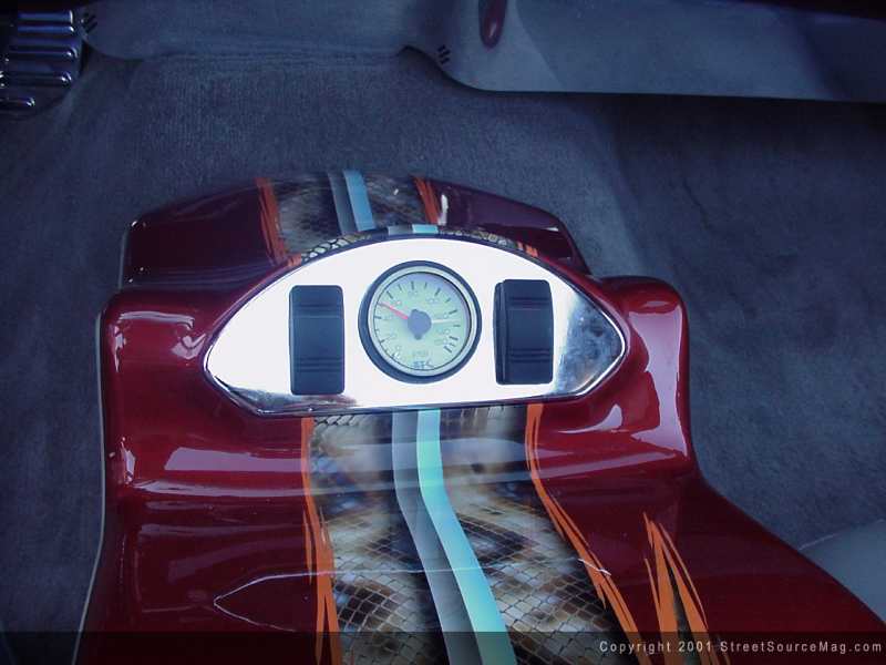 | These gauges are used to help let Bill know when he is about to lose another finder to mother nature. | Bringing the rear down meeting the current front status was found to be a little more work then what originally thought. This wasn't because they thought it was going to be a simple project, but more along the lines of keeping true to the Ekstensive Metal Works theory on customizing rides; "If you are going to customize your ride, then do what others have strayed away from." This isn't a direct quote, but more less what I think when seeing the work that they tend to put out with each and every ride. Beginning the rear, the frame rails would be cut out and step notched to provide the room needed to lay out with the front. Bill being happy with the current notch in place, the next step was to mount up the chrome Ekstensive panhard. A 2-link custom Ekstensive suspension design would be next on the table. With the 2-link in place, this allowed mounting up of the Firestone airbags along with the chrome KYB shocks.