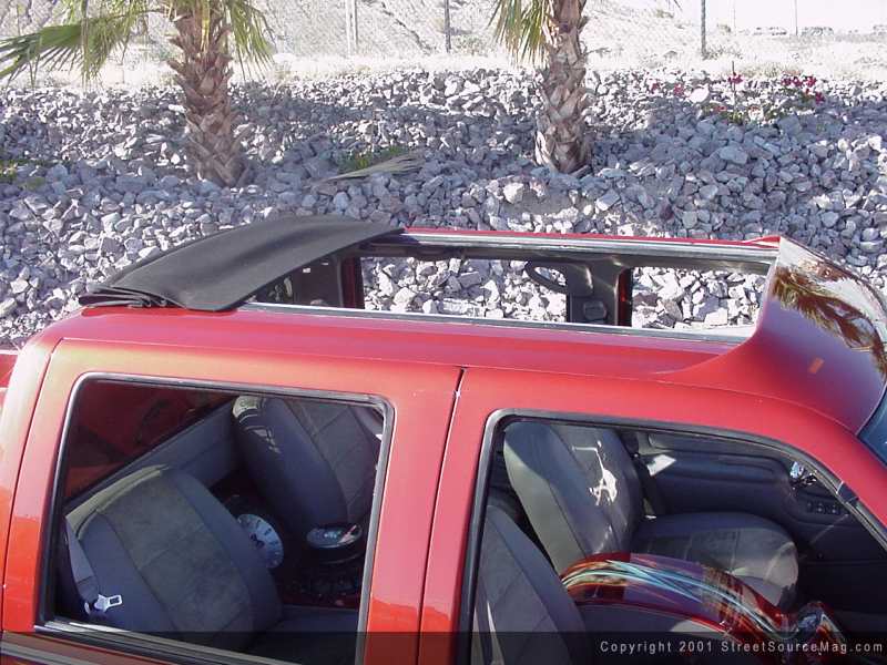 With the body smooth, it was left up to the professionals at Pat's Auto body of Houston Texas to prep the body and lay the paint. The conclusion was to give the body a two-tone look with just the right colors. The choice of colors would be Lexus red and Chevy puter. To help break up the two colors, Bill dropped off the Dually with Pat Maxwell of Maxwell Designs of Houston TX. While in Pat's hands he was to lay graphics from front to rear along with throwing graphics throw the dash and center consoles. The attention to detail in Pat's work is something to be desired. | Not missing anything......including jams. |