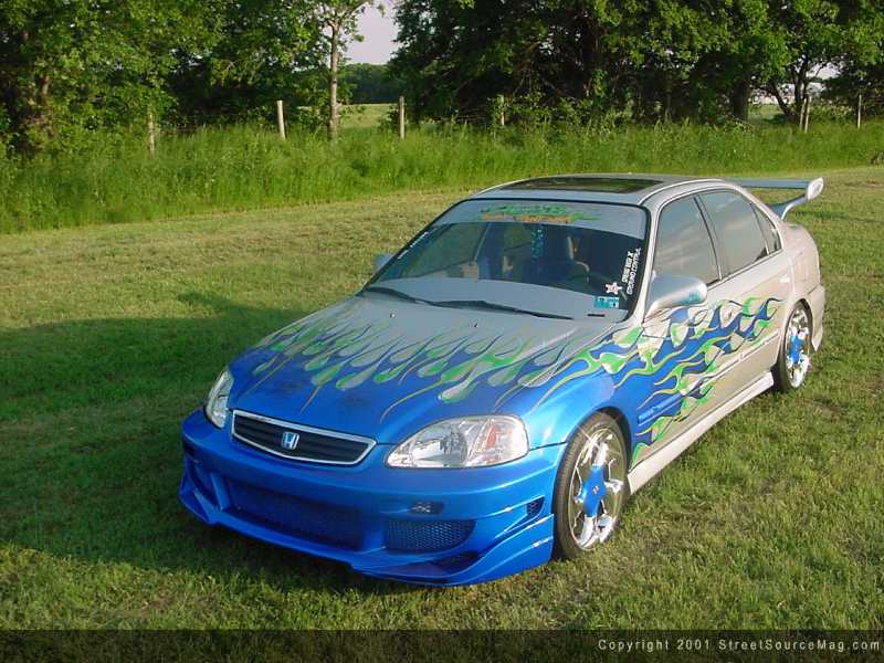 Levi bought his little prizewinner in June of 1999, and since then he has sunk $10,000+ into the car to form it into what you see today even though he says, "he is not done yet" it is close enough for me. Soon after Levi bought his car he new that he was going to show it so he immediately slapped some 17s and a body kit on it and 3500 worth of stereo equipment just to get things started. After about 4 months of working on the car getting it ready for its big debut on the show scene Levi walked outside from school one day to find his civic gone. Luckily the car was found 2 hours later but unfortunately it was totally stripped, so it was back to the drawing board for Levi.