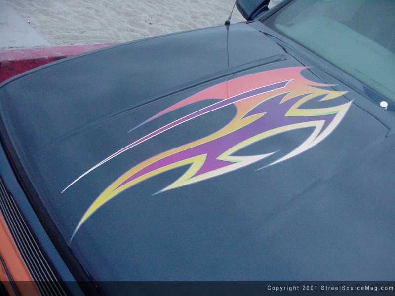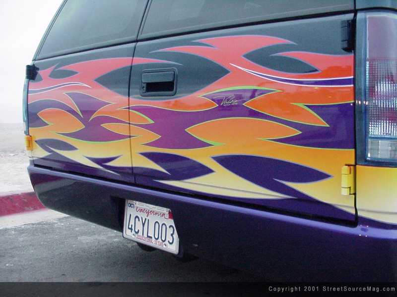 Next a design of tribal graphics would be sprayed and stripped. In the graphics you will find shades of blue, orange, purple, violet and yellow. Each color is pinstriped to bring out each graphic. The colors of choice for the strips would be lime green, silver, blue and lavender.