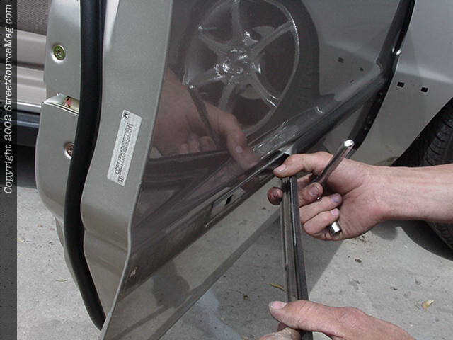 2. Don't worry about being gentle pulling off the moldings, your are shaving them so I doubt you'll be putting them back on anytime soon. With a little force just pull the molding back. This goes the same for the small molding on the front fenders. The plastic fittings holding them in will break off allowing you to pull them off. 3. With the front doors and fender taken care of, repeat on the back door. Get a flat head screwdriver or something flat to help begin pulling the molding back.