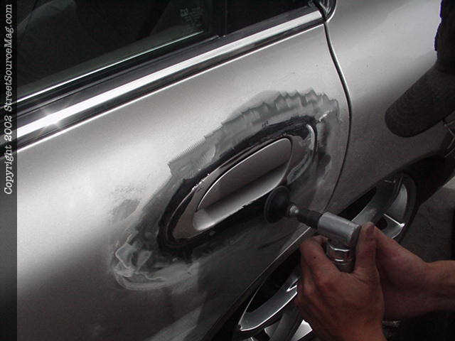 6. Once the door handle is back in place and the ready for the Everglass, you will then need to grind the paint off the door. Make sure and get a good couple of inches around the door handle for an even bond of Everglass. 7. After the Everglass is applied, then sand down smooth and glaze over it with spot putty to take away any low spots in the work.