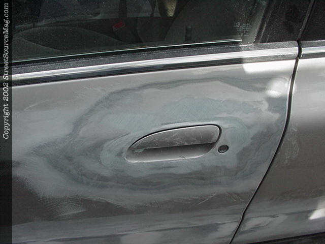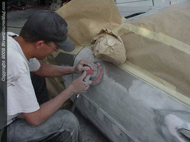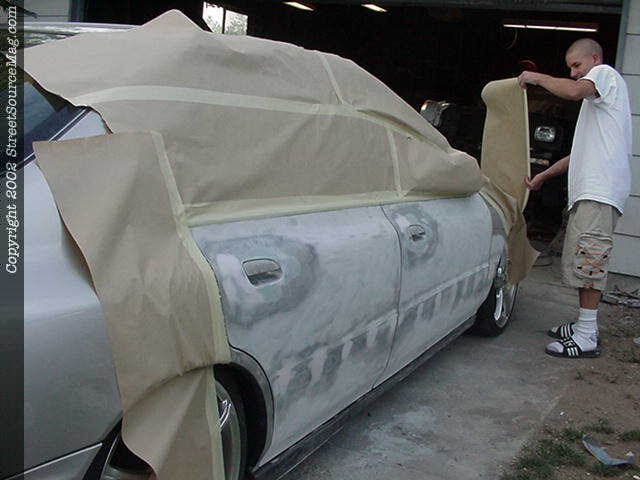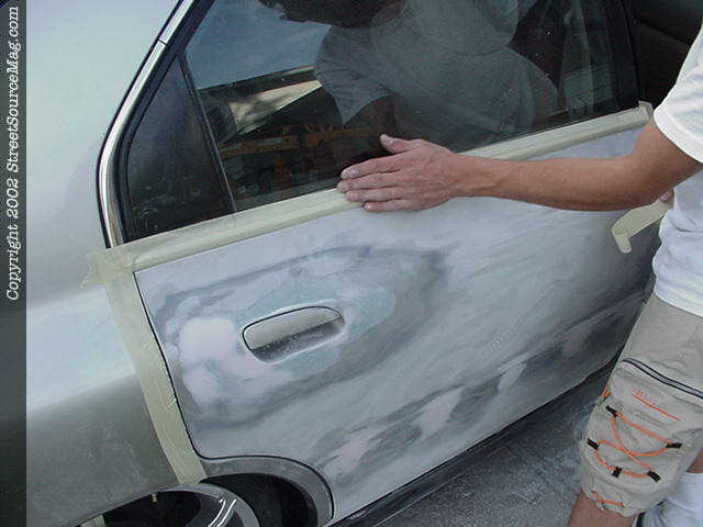 9. Before primering the doors remember to sand the entire door down or the spot you want primered ensuring a good bond. 10. With the masking complete, we chose to primer the entire door since the bottom half needed primer cause of the shaved moldings. Work done by:Waldo's Custom's and RestorationJohn "Waldo" Bartels208-283-3305