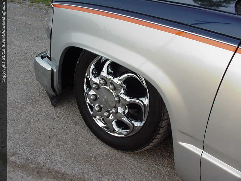 Nelson not only wanted to be noticed visually when he cruised his dually, but he also wanted everyone to hear him, no matter how hard of hearing they were. With that in mind, KUSTOMWERKS again took the necessary steps and installed a massive system that anyone could enjoy. In the bed of the dually, KUSTOMWERKS built a custom box ported into that cab that houses eight Audio Art 10" subs, which are powered by an Audio Art 100HC amplifier. And Audio Art 140.2XE amp gives power to the mids and tweets and a Pioneer DEH-65 head unit send the signals throughout the system. Nelson's choice of rollers come from Neeper Concept and their N8 dually wheel in 16x7 fashion. Winston 225-55-16 tires lovingly wrap the chrome Neepers.