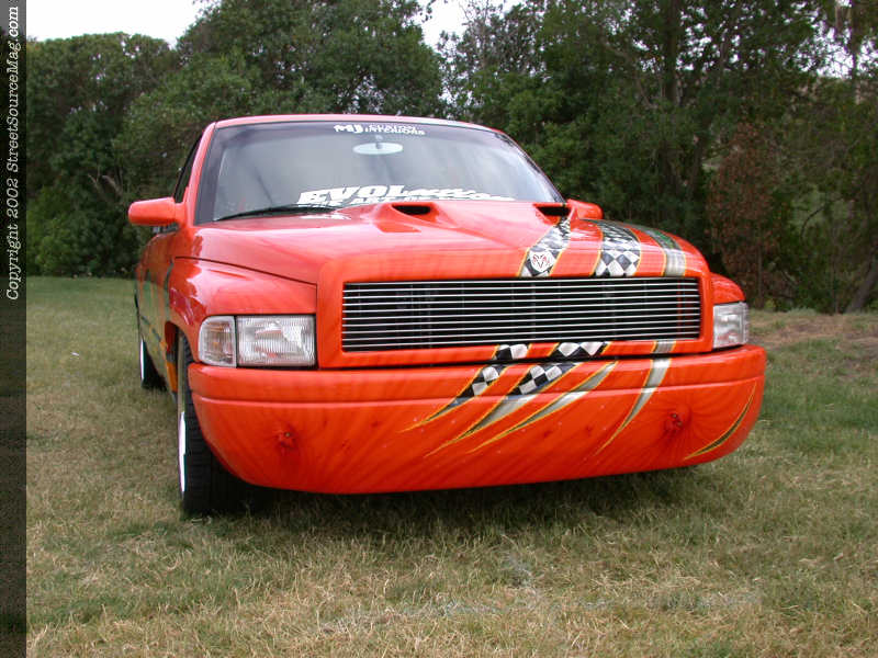 Moving to the rear, the doors would be shaved of the handles and the stock mirrors where replaced with a set of Street Scene mirrors. The gas filler was shaved smooth and relocated into the bed. When you get to the rear of the Ram you first notice the 1978 Caddy taillights frenched in replacing the stock lights.