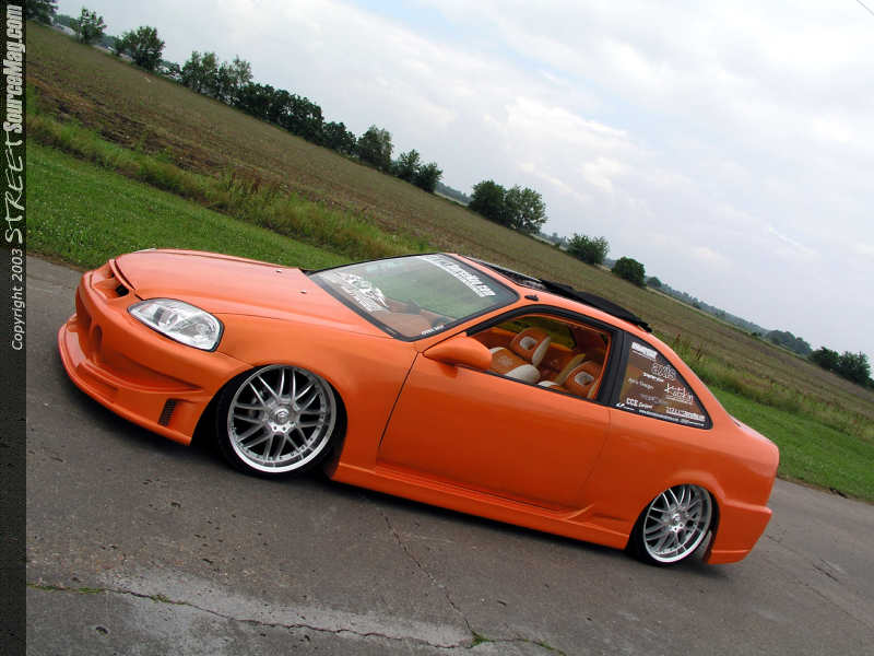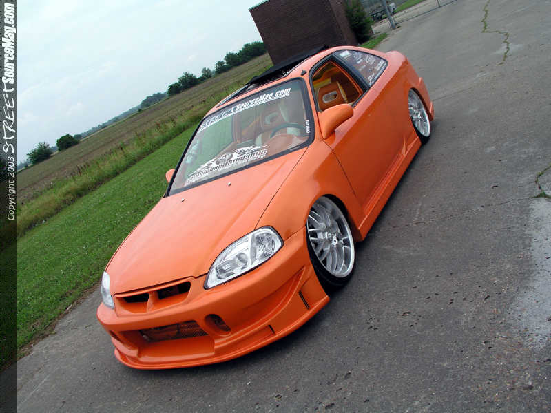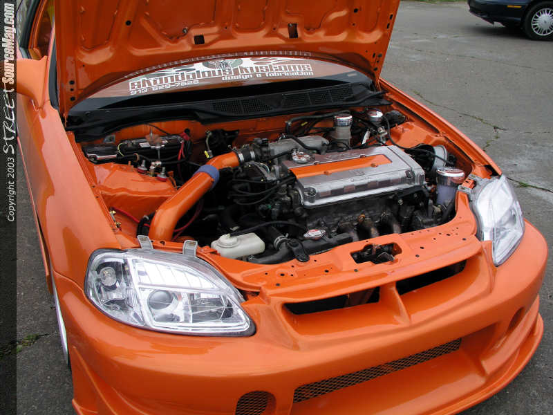 Luke had always been into Mini Trucks. He had built a slew of body draggin minis and was just willing to prove a point to everyone out there that said "You can't make an Import Custom". Well we think Luke has done an outstanding job of breaking down the walls and preconceived notions that all Imports are not custom. Luke started with a bare to the bone 2000 Honda Civic with as few extras as he could find. Luke's theory was the more it has that's just that much more he would have to remove. So when he found his Honda in the spring of 2001 he was off to prove a point and dispel as many prejudices as possible. The first order of business was to strip the car down to the bare uni-body. The motor was pulled as to gain access to the firewall and provide more room to work on the custom aspect of the car. While the motor was out the firewall was treated to the same treatment the exterior would be receiving.