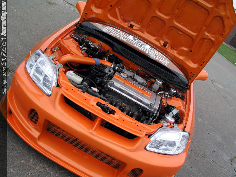 With the firewall cleaned of waste and the engine compartment as sanitary as a commode at Caesars Palace Luke decided the poor lil 1.6 Honda motor would not fit the bill, so a Honda B20 2.0 V-Tec motor swap was in order. Sandwiched between the motor and tranny a CenterForce II clutch was installed. With the motor now in place Luke removed several items to be either chrome plated or polished to a high luster. A DC Sport 4.1 header was then installed to expel spent gasses from the motor. For a better breathing treatment an AEM Cold Air intake was added.