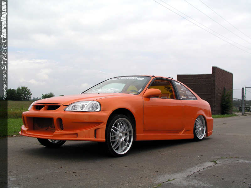 Luke went over the entire car multiple times wet sanding and re-priming the car until it was in mint condition. With the body now ready to accept it's new hue Luke and the crew laid down generous coats of Lamborghini Orange from PPG. Once the body was dry projector headlights were installed into the front clip. In true mini trucker fashion Luke installed a StreetBeat sliding ragtop into the skyline of the Civic.