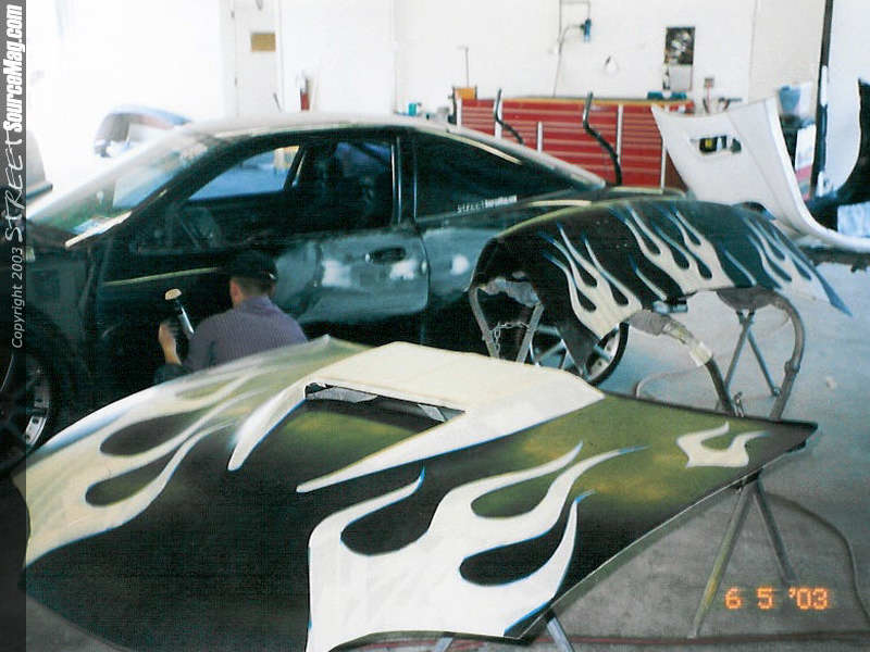 PorkChop with DA, interface pad, 500 grit sand paper, a bottle of water, and a big penis (it's in there, look close, haha) Porkcop goes nutts with some badd ass flames fine lined and masked off. Porkchop does the same thing with the trunk lid.