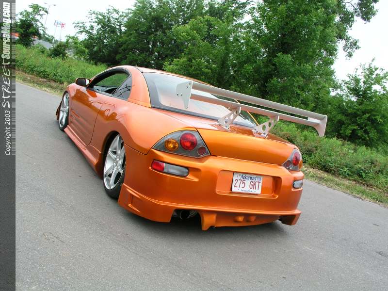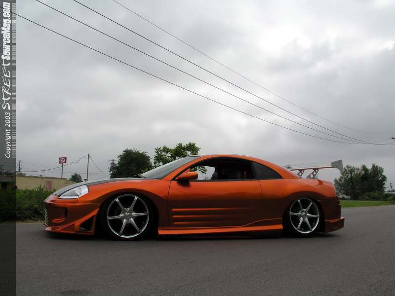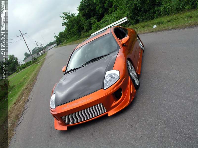 The next item to grace the Eclipse was a new carbon fiber hood and a custom one off grill. An aluminum wing was then added to the rear deck lid to apply the down force needed to keep the Eclipse firmly on the tarmac, and to look good too. Now that the body was in order it was time for an altitude adjustment to the Eclipse. Jay called and ordered a set or strut bags for the front and a set of Firestone 2500's for the rear. Once the adjustable were installed a Viar 450 was called upon to supply the needed pressure the system needed to get the car off the ground.  A three-gallon storage unit was properly hidden out of sight in the wheel well and (4) ½" Parker gold Valves were plumbed with ½" line to get the pressure to its proper place. With the suspension now in order Jay ordered a set of Konig Verdicts in the form of a 19X7 shod with 225/35/19 shoes from Yokohama Parada's.