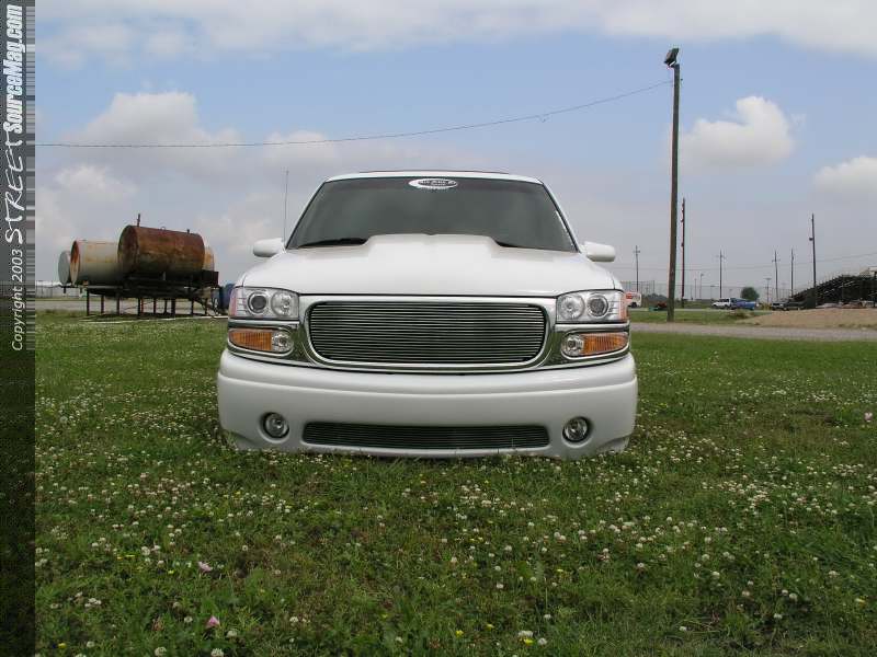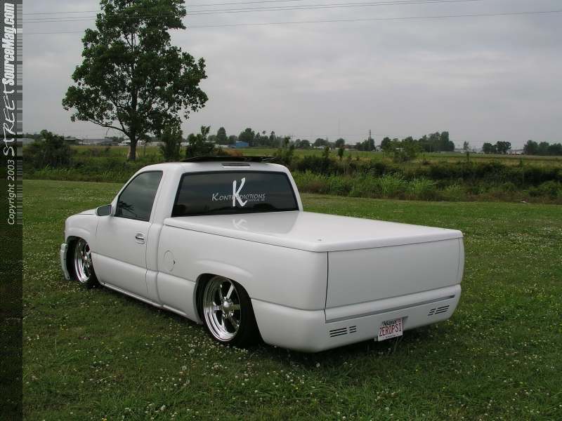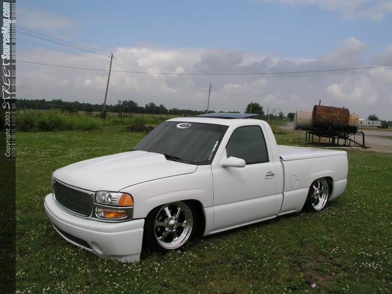 To cover any precious cargo Brooks might haul a Snug-Top fiberglass cover was installed onto the bed. Once Jack had the body looking righteous he then applied several coats of Standox White hue to the entire truck. Once the paint was dry a T-Rex billet grill insert was installed to complete the Denali conversion. The next major order of business was to visit Jessie Dickerson at AirRide by Jessie so the frame could be planted firmly on the ground. Jessie started by ditching the factory spindles in favor of BellTech 2" drop spindles. While the front end was torn down Jessie installed a pair of Firestone 2600 air bags were the coil springs once resided. For the rear Jessie custom built a 4-link cantilever set up with another pair of Firestone 2600's on the lower bars for more lift. Jessie then ran 5/8" stainless steel tubing from each bag and installed (8) Parker Gold 5/8" electric valves for complete control of each corner. Two Viar 450 compressors were plumbed thru two 5-gallon holding tanks for air on demand. A clean setup of Dakota Digital gauges were installed in the cockpit area to monitor each bags pressure at all times. Now that the Denali had the ability to get itself off the tarmac it was now time for some new rolling stock.
