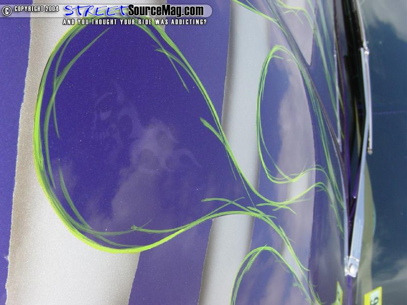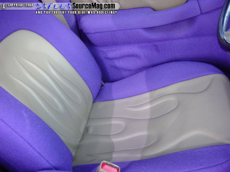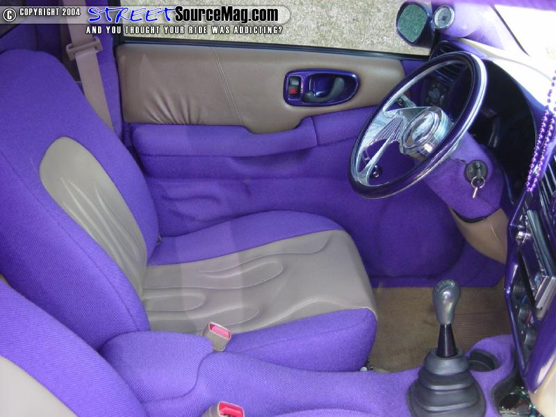 While the interior was stripped out to allow the graphics to be ran into the doorjambs, Nathan took this time to get the interior up to par with the new paint job. Most of the interior panels were wrapped in purple tweed and tan vinyl.  The stock seats were thrown out for a new set of Oldsmobile Brevada buckets. The door panels, headliner and seats all had flames sculpted into them before the material was put on.
