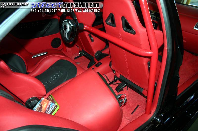 Up front the Momo seats were wrapped in red hide just like the rear, and also fitted with aluminum breather holes. The a, b, and c pillars were all custom built and a Momo steering wheel was bolted up. Next Kindig welded the 1 5/8” roll cage into the car.