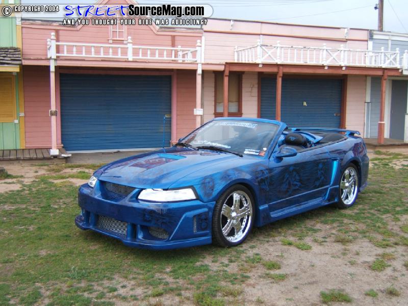 From a distance, as Brooke cruises this drop-top Mustang down the strip, the only thing you notice the wheels, twenty inch D’Vinci wheels wrapped in 255-35-20 rubbers. As the car draws closer the next thing you notice besides the thumping stereo is the paint but it isn’t until it is completely next to you that you notice the wicked airbrushing that covers Brooke’s Stang from head to toe.