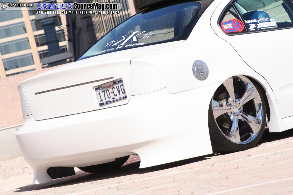 36” Hi-Tech LED’s would replace the taillights while a polished aluminum billet gas door replaces the stock filler door. The license plate box would then be frenched in and a 35x40 Streetbeat sliding ragtop is found in the roof.