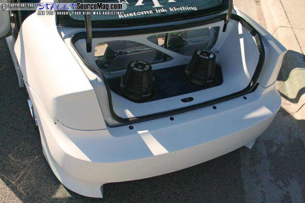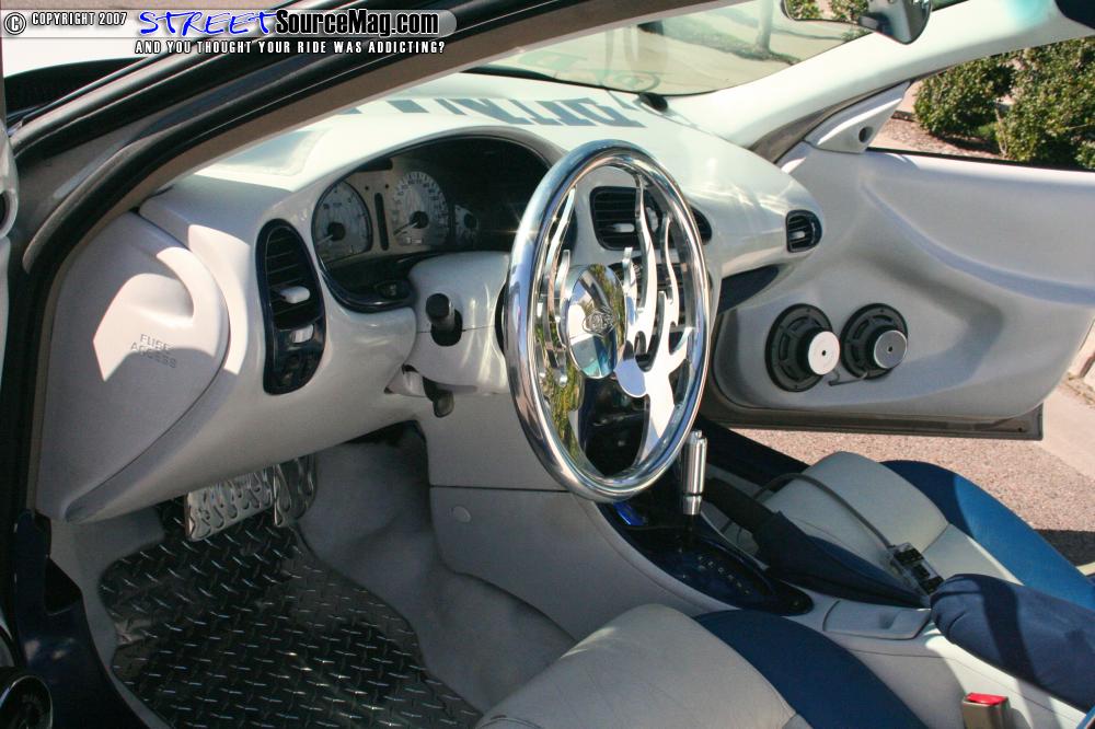 Working everything together, blue suede would be found on panels, rear deck lid and headliner, while the seats where wrapped with Katzkin leather. Diamond plate floor mats are found on the new ACC Mats white carpet while a B.A.D. tribal flame steering wheel, Trenz rearview mirror and pedals are found installed to help finish things off.
