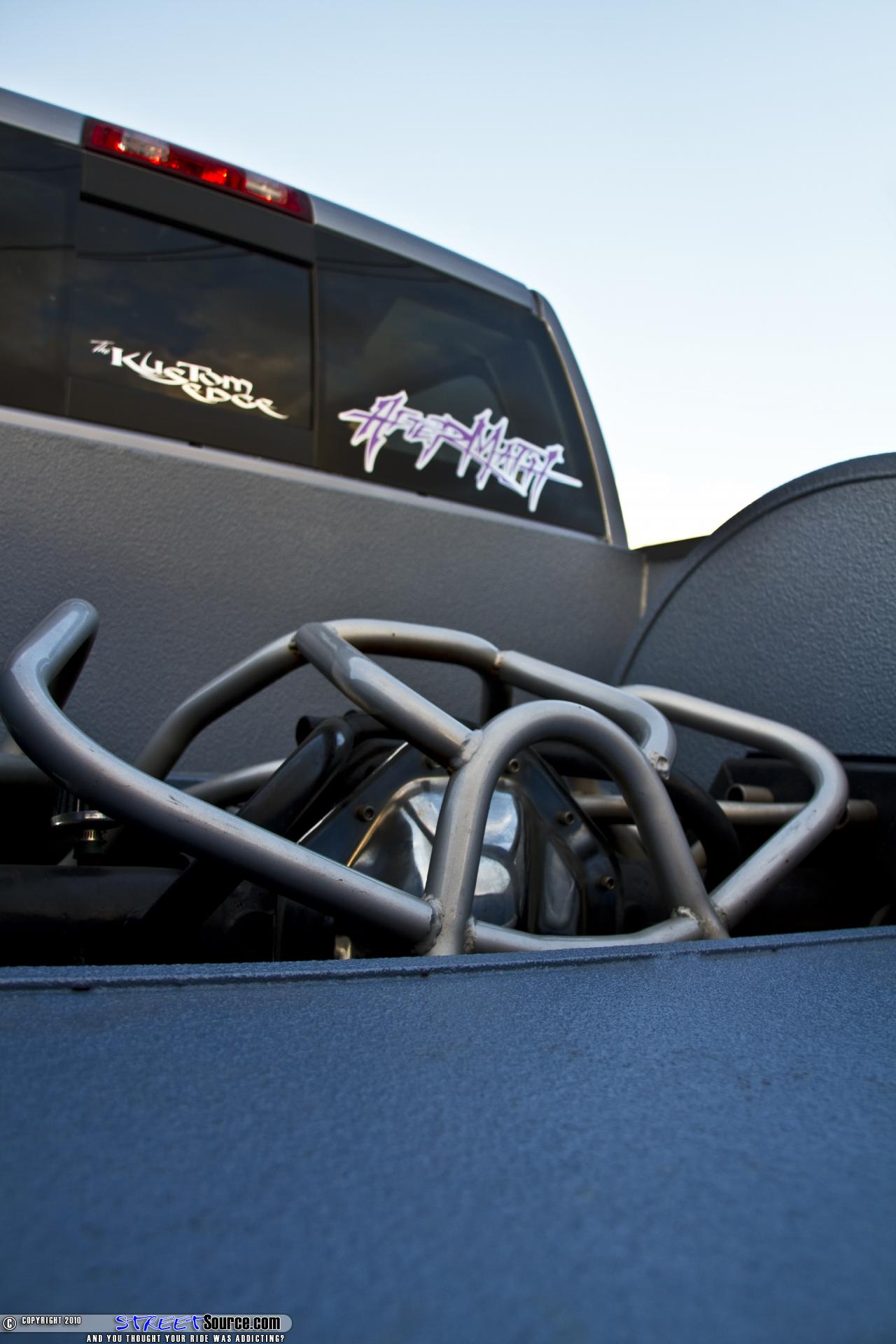Potter and Robert "Robbo" Crowell started the cutting process in the rear of the truck. They stripped all the stock suspension off and started building a complete custom back half. 2x4" square tubing was used for the frame rails and a bag on bar set up was designed to work with a triangulated wishbone three link. A removable custom bent tubular bridge was built and powdercoated. The rear axle ended up being narrowed a total of 10" to tuck his new chrome 24" Boss wheels. Next they moved up front where the suspension would be a bit more difficult. They started by "Z'ing" the frame 2 inches. Then they built upper control arms with uniballs, raised them 5 inches, and narrowed them 3 inches from the stock length. The lower custom tube control arms were shortened 1.5 inches. McGaughy's spindles were added along with Slam Specialties bags on the front and rear. Everything was hard-lined with 1/2" aluminum lines. Dual Viair 444's, Viair gauges, two 3 gallon tanks, and an AVS brass knuckle switch box round out the air management. And just for some added fun train horns were thrown in. The bodydrop was next and began with a 2 inch channel, lowering the body mounts and front frame horns 2 inches, and tubbing the floor for transmission/driveshaft. This resulted in a brand new Dodge laying rocker.