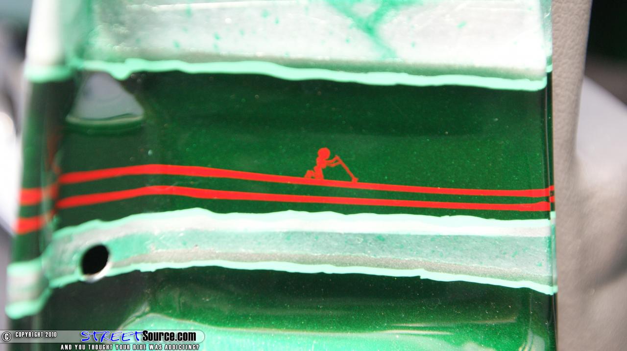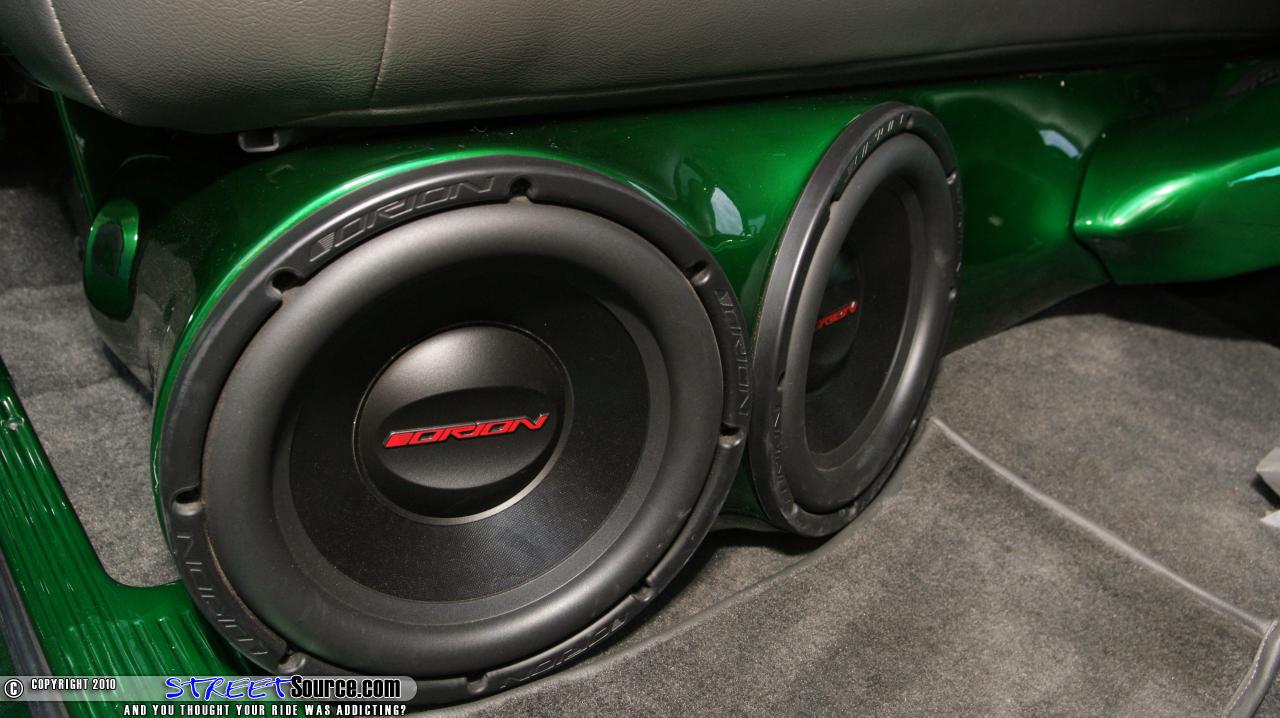Although this truck has always been easily recognized by its smooth body and unique green and black two tone paint scheme, it too was showing its age. One of the doors and the inner bed floor began to have serious cracks in the body filler, along with other blemishes from use over time. Although it hurt to tear into such a nice paint scheme, Mellon stripped the door and redid all of the metalwork to both straighten and greatly reduce the amount of filler in the door. Moving along to the bed floor, Mellon began finding other areas that needed attention as well. But beyond the body and suspension work, the interior on the truck remained immaculate. The dash and door panels are still remnants of the original “Evil Twin” paint scheme while the other interior panels were wrapped in medium graphite leather and suede by Mike Sutton in Long Beach, California. Even more impressive is the ground-pounding system installed b y Ghetto Bob at 702 Motoring. The custom fiberglass box and floating center console house four 10” Orion subs while the custom fiberglass amp rack houses the Orion amplifiers. Two HE800 Kinetik Audio Powercells provide the juice to keep this system pounding.