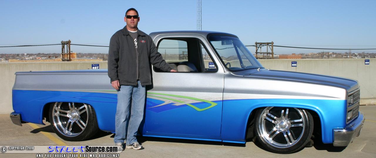 Doane’s C-10 was taken to Hills Hot Rods in Lubbock, Texas for Jason Hill to put his signature on it. Doane’s truck was outfitted with shaved door handles, custom tail lights, ‘91 Suburban grille insert, along with Suburban headlights, and a Suburban rear bumper. Hill painted the truck blue and silver with orange, red and blue pinstriping. He also added his one off water effect along with flames, shadows and chrome trim.