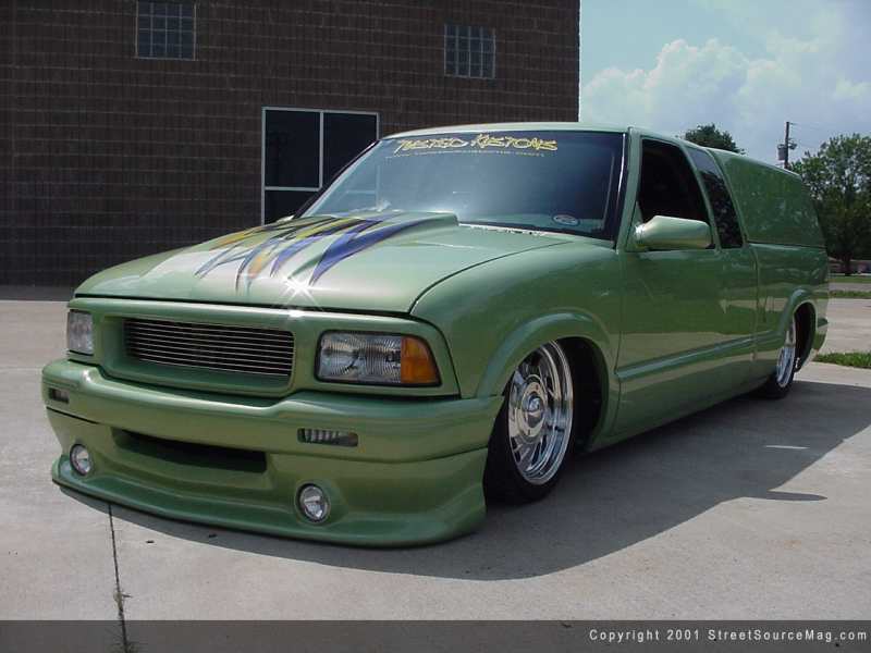 TJ picked up a set up '98 Chevy Blazer power bucket seats and had them recovered in light grey and slate grey tweed. The headliner, complete with biohazard symbol, was wrapped in slate grey tweed also. Everything that could be removed was wrapped in either slate grey or light grey tweed. Billet goodies here and there give TJ's interior accents. Wilbanks Auto Trim was responsible for all interior work performed on TJ's Sonoma.