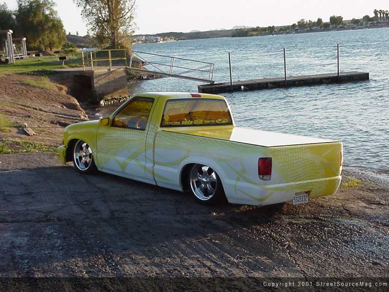 With only taking 2 months for the build up, what Jon got for his money was a phat ride that was bright enough to burn your retina. What was the reason for building this vehicle you ask? Well that is simple. This particular S-10 is used as a display vehicle for the talents of Street Boutique Customs of Santa Clara California. After Jon took his S-10 in for some pinstriping, the magicians of SBC had more in mind. One of the first things they did was to get rid of all the unnecessary equipment. To do this they first shaved the door handles. Next they welded in a Sir Micheals roll pan with frenched in license plate box. They then ditched the stock taillights and replaced them with some Chevy S-series Blazer tails. Also to the rear, the tailgate, handle and bed stake pockets where shaved. Now that the ass end was respectable, the gas filler location had to be shaved and relocated into the bed of the truck. Next it was time to smooth in the cab seams and ditch the antenna. After welding the tailgate shut and smoothing everything out, it was now time for some paint. To give the S-10 an even smoother look, a set of sport mirrors were also added. Now that the body was shaved and smoothed it was time to apply the Retena Burn yellow PPG paint. The masters at SBC laid down the Retena Yellow along with Gold and Yellow pearl tribal graphics and checkers. To complement the yellow paint, SBC also tinted the glass with yellow film.