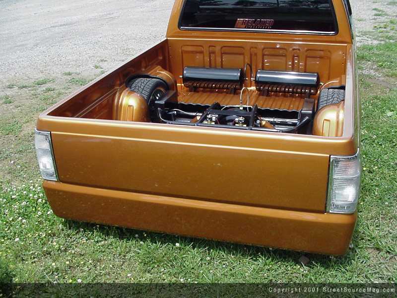 Chris first contacted Eric at Kustomwerks in Union City, Tennessee for a little altitude adjustment. Eric and his partner is crime, Strip, went to work. In the back, a Ford Courier rear-end was utilized along with a Pete And Jakes 4-link to create a cantilever-style rear end with the Firestone airbags actually mounted on top of the 4-link. Custom tubing was cut and welded in throughout, this gave Chris’s Mazda a truly one-off look. Up front, lowered control arms with yet another one-off setup was created, with the bag being mounted on top of the upper control arms. Kustomwerks also built a custom sway bar for Chris’s Mazda. To make things look nice and pretty, all original welds were smoothed and braided brake lines were added. To get Chris’s Mazda off the ground quickly, Kustomwerks installed their very own fast bag valves. With the suspension the way Chris wanted it, he decided body mods and new paint were in order to keep the ball rolling. A new smooth look was in order to give Chris the look he was striving for. Any and everything was shaved. The bumper holes were filled in to start with. Next, the wiper cowl, emblems, mirrors, door handles, gas door, bed seams, and tailgate handle. A steel roll pan was molded in and the tailgate was completely closed. Several people were responsible for Chris’s body mods, including Jeff Pfifer, Shane Wickham and Eric at Kustomwerks.
