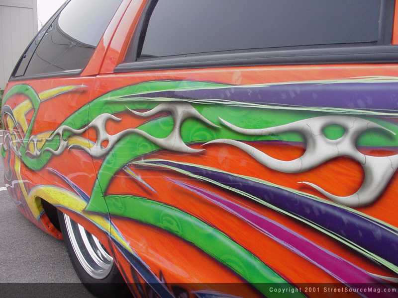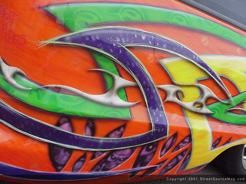 Not done yet, Max would then apply many different airbrushed skulls and what not bringing the entire paint job together. Maxed out Paintwurx, which is Max's business, is responsible for all of the body and paint applied to this eye-popping monster.