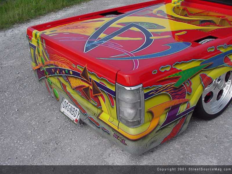 Many different designs were laid down across the hood and panels of this Mazda, carrying over the to rear custom speaker box enclosure.   After finishing up the Mazda with a ton of PPG pinstripe colors, Randall laid down enough clear to make the Mazda look like glass. The outcome was spectacular.
