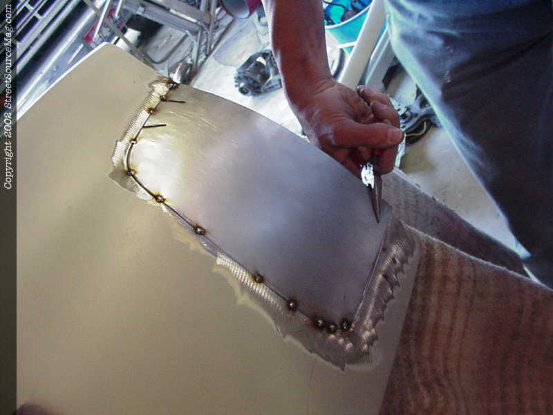 4. Helping to get the correct curve in the bodyline, John put to inch and a ½ slits to get the upper corner to bend correctly before starting his welds. 5. Happy with the fillers, it is time to start tacking to sheet metal into place. 6. The bottom of the filler didn't quit won't to roll as we liked so it was pulled out with a set of pliers and then tacked into place as liked.