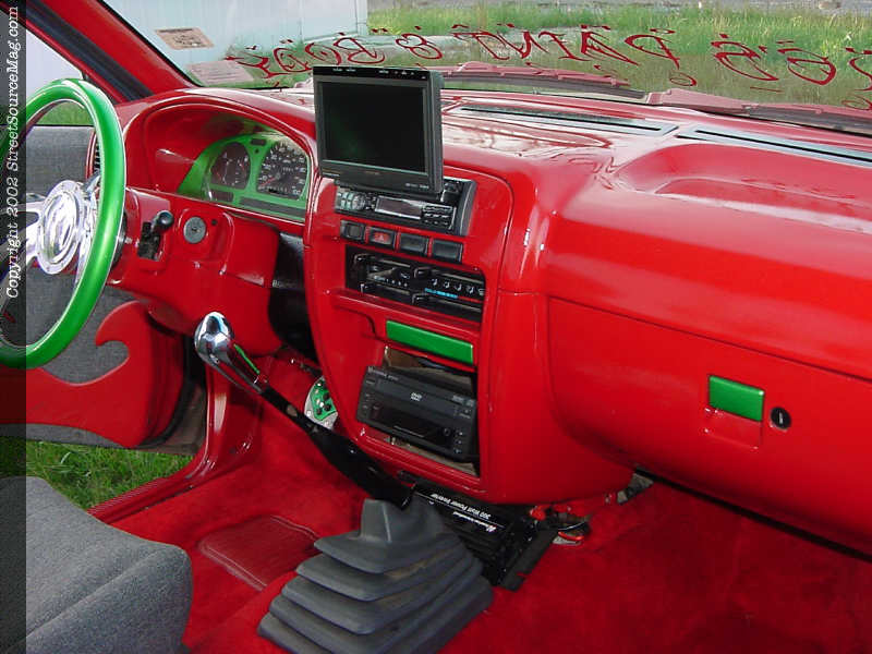 For the interior Kyle brought the outside look to the inside by painting the dash and all the plastic. For door panels, seats and headliner Kyle had Custom Threads By Troy wrap them in gray tweed with red vinyl tribal flames stitched into them.