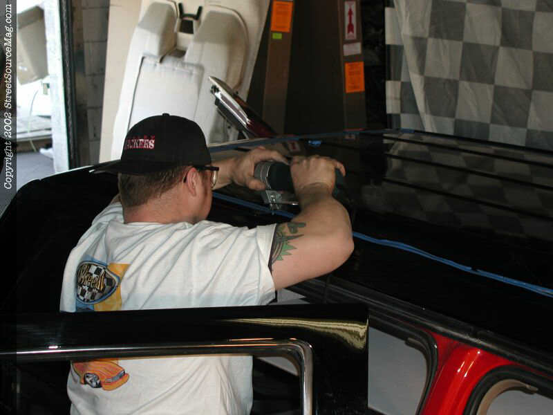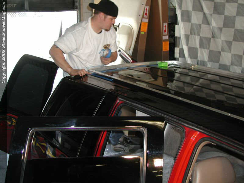 Not sure what was happening here, my eyes were shut! Actually, John had it under control. He is making the initial cut in the roof. Here, he is continuing with the initial hole in the roof. This is the view from the inside. After test fitting the frame, John trims a few areas for a nice snug fit.