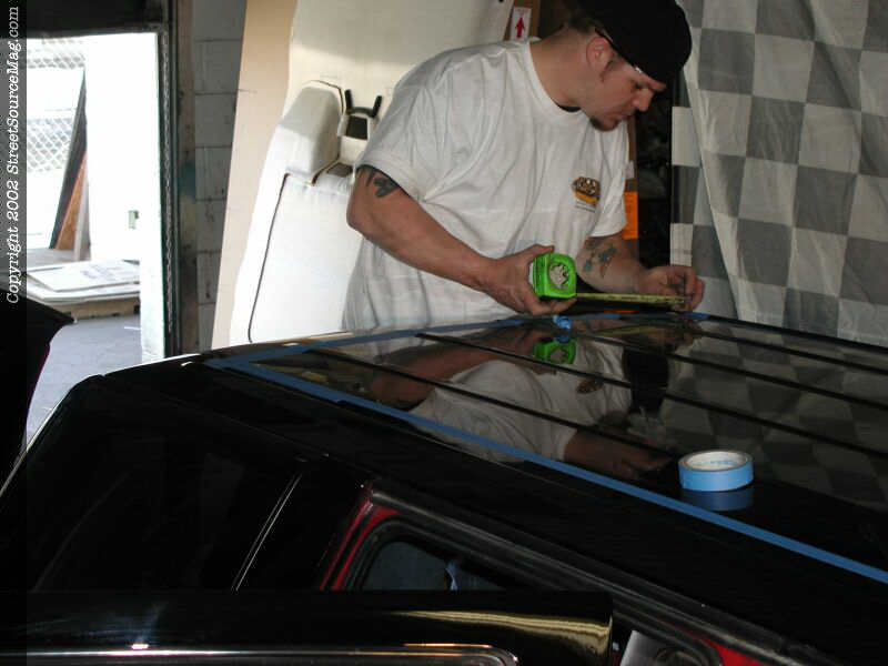Next, the frame is outlined in masking tape so that the pencil will show up when he outlines the opening. Make sure that you measure twice and only cut once. This is critical when cutting a large hole in your roof. A pilot hole must be drilled in order to insert the electric sheers that will cut the rest of the roof opening.