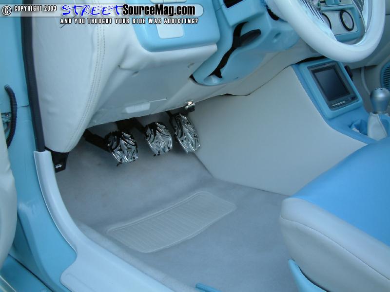 The seats would then all be wrapped in white and baby blue vinyl to help bring things together. An AIM control Panel would then be installed and the vents in the dash would all be sprayed baby blue. To finish off the interior, a 1 off custom center console would be installed housing a PS1. Jason Dunn of Salem Or, is responsible for the interior needs.