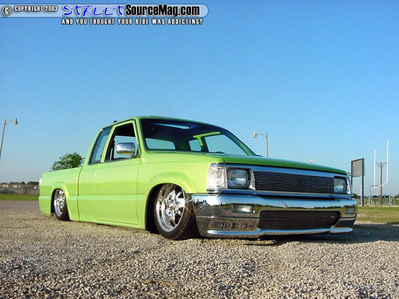 Along with all this bodywork Jim also welded the tailgate shut and molded the top of the bed in except for the front section where you can find the compressors and air tank for the air ride and the gas filler neck. To add to all this badass bodywork Jim yanked the front grill and bumper off and replaced them with a FBI billet insert and a Toyota 4x4 front bumper. With the body prepped and primed it was time for some paint, the color of choice for this amazing Mazda would be Dupont