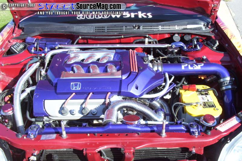 Turning his attention to the engine compartment Justin noticed it was lacking the same luster as the exterior and interior. So he polished the intake manifold, custom painted several items and then added an AEM cold air intake. To replace the nasty stock hoses, Cool Flex hoses were then added for coolant circulation functions. To ensure the proper fire power reached the motor a set of Magnecor plug wires were added. A Comptech header backed up by an all polished stainless steel 2 ½" exhaust with a polished cat and a pair of Greddy polished mufflers were added to ensure the Accord was not all show and no go.