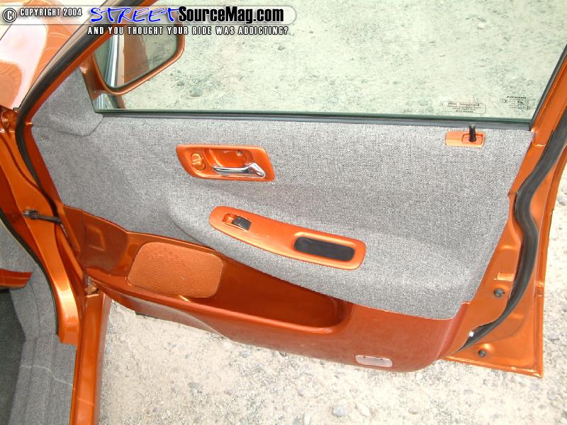 With the smooth sweet exterior, Tanya would have Jason next get down on the interior, his specialty. For starters the dash would be wrapped in tweed while the control panel would be shaved and the vents painted to match the exterior. The door panels would then be housed with half tweed and half paint to help pull the exterior feel into the interior. The headliner would also be applied with the same gray tweed with flames embossed for that extra custom look.