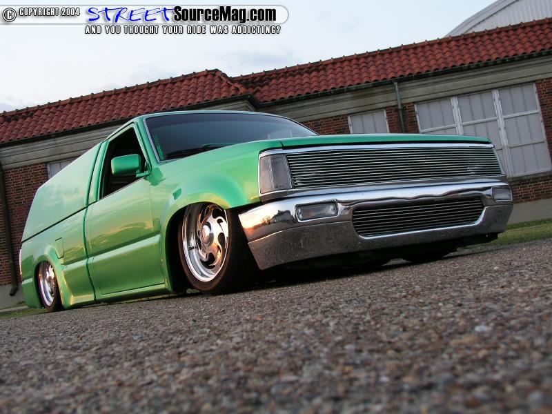 Once the body was looking straight Jimmy would then drop his truck off with a local shop to bag it and set the frame on the ground. After a year of nothing but issues Jimmy decided that dragging frame just wasn’t going to cut it and he wanted to plant the rockers firmly on the ground instead. So with a call to Off the Chain Customs in Jackson, MS the Mazda would soon be sporting a new body dragging stance.  The crew at Off the Chain decided that a 3” body drop was just what the Mazda needed, so with sawzall and welder in hand the body was firmly planted on the shop floor. After giving the previous bag job a once over it was decided that it would need to be rebagged also. So Off the Chain rebagged the front using Firestone 2500 bags with relocated radius arms to allow proper clearance. Out back a new 4 link was installed along with 2600 Firestone bags. For air on-demand 2 Viar 450s were plumbed thru (2) 3-gallon tanks keeping everything below the bed floor. Boyd Coddington Coddzilla would be Jimmy’s wheel of choice wrapped with 215/45/17 Kumho skins.