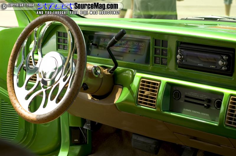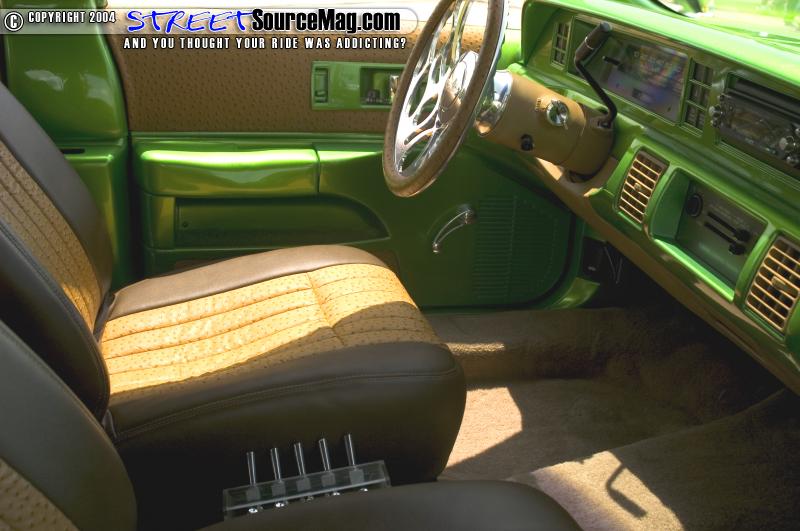 For the seats they switched out to four Impalla SS buckets all of which were covered in Ostrich and brown vinyl. The door panels were also given the same treatment along with some billet knobs to go along with the Trenz billet steering wheel and rear view mirror.