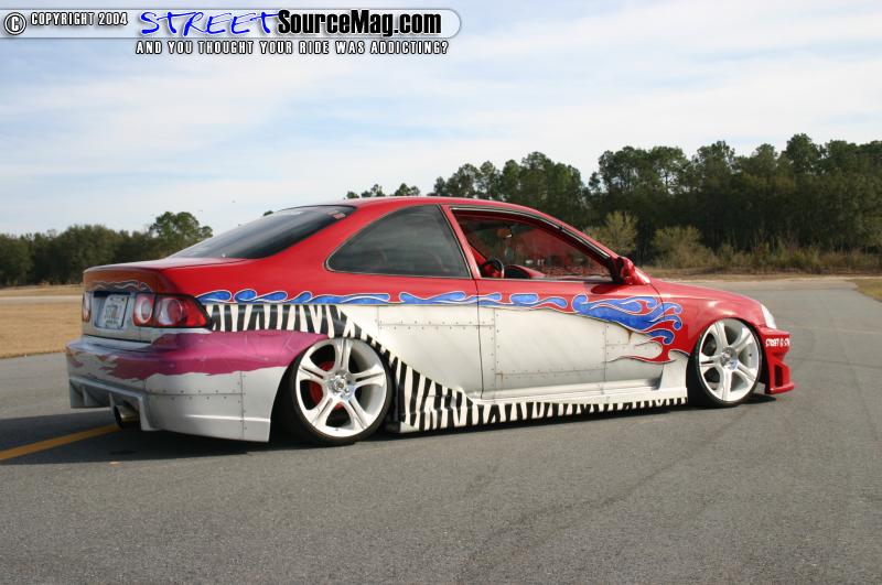 The body kit was then molded to the body of the car and the real bodywork was started. Next Street Styles would shave off the side moldings, door handles, and flush the license plate into the trunk to give it a cleaner look. With all the major bodywork done it was then time for Gary and Donnie Novak to come up with a crazy paint job to finish the exterior off. The Civic sat in the booth prepped and ready for paint while Milano Red was mixed up for a base coat.